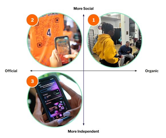In this framework, we found it useful to plot these touchpoints on vectors based on how official or unofficial the channels were, and how individual or social they were: