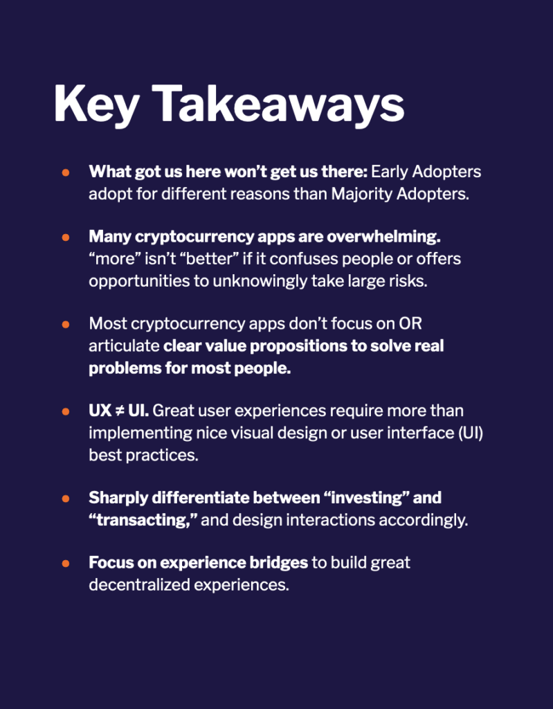 Our core question: what attributes of today’s experiences create barriers to adoption for people who might use cryptocurrency for retail finance purposes? We identify two large barriers to adoption: