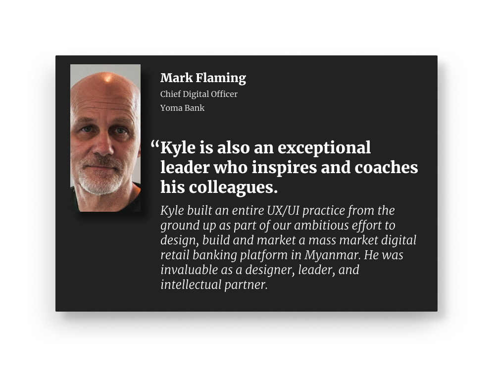 Emerging market finance is my favorite space to work in, so when my friend and frequent colleague, Lauren Serota invited me to build and lead a UX team at Yoma Bank in Yangon, Myanmar (Burma), I was quick to say yes.