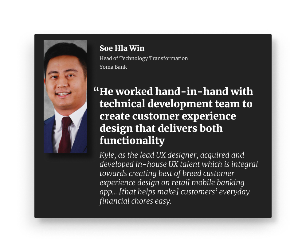 In my time at the bank, I build, trained, and led a team of local designers helping them embed design in the agile design process which maintained a handful of app experiences for different banking functions. I also led the design of the bank’s flagship consumer app which would launch during my time in Myanmar as a an MVP to help the bank maintain its competitive position. Under the care of the team I left behind, the app has grown into the full-features vision that we developed back in 2018.